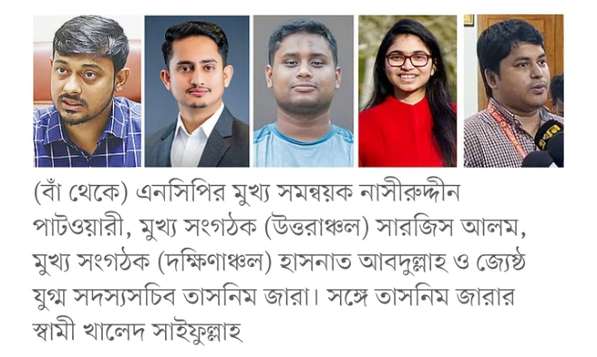 (বাঁ থেকে) এনসিপির মুখ্য সমন্বয়ক নাসীরুদ্দীন পাটওয়ারী, মুখ্য সংগঠক (উত্তরাঞ্চল) সারজিস আলম, মুখ্য সংগঠক (দক্ষিণাঞ্চল) হাসনাত আবদুল্লাহ ও জ্যেষ্ঠ যুগ্ম সদস্যসচিব তাসনিম জারা। সঙ্গে তাসনিম জারার স্বামী খালেদ সাইফুল্লাহ