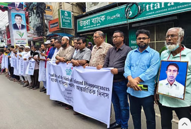 আজ শনিবার গুমের শিকার ব্যক্তিদের স্মরণে আন্তর্জাতিক দিবস উপলক্ষে খুলনায় মানববন্ধনে অংশ নিয়ে গুমের শিকার মোখলেসুরের বাবা শেখ আবদুর রাশেদ ছেলেকে ফেরত পেতে সরকারের কাছে সহায়তা চান।